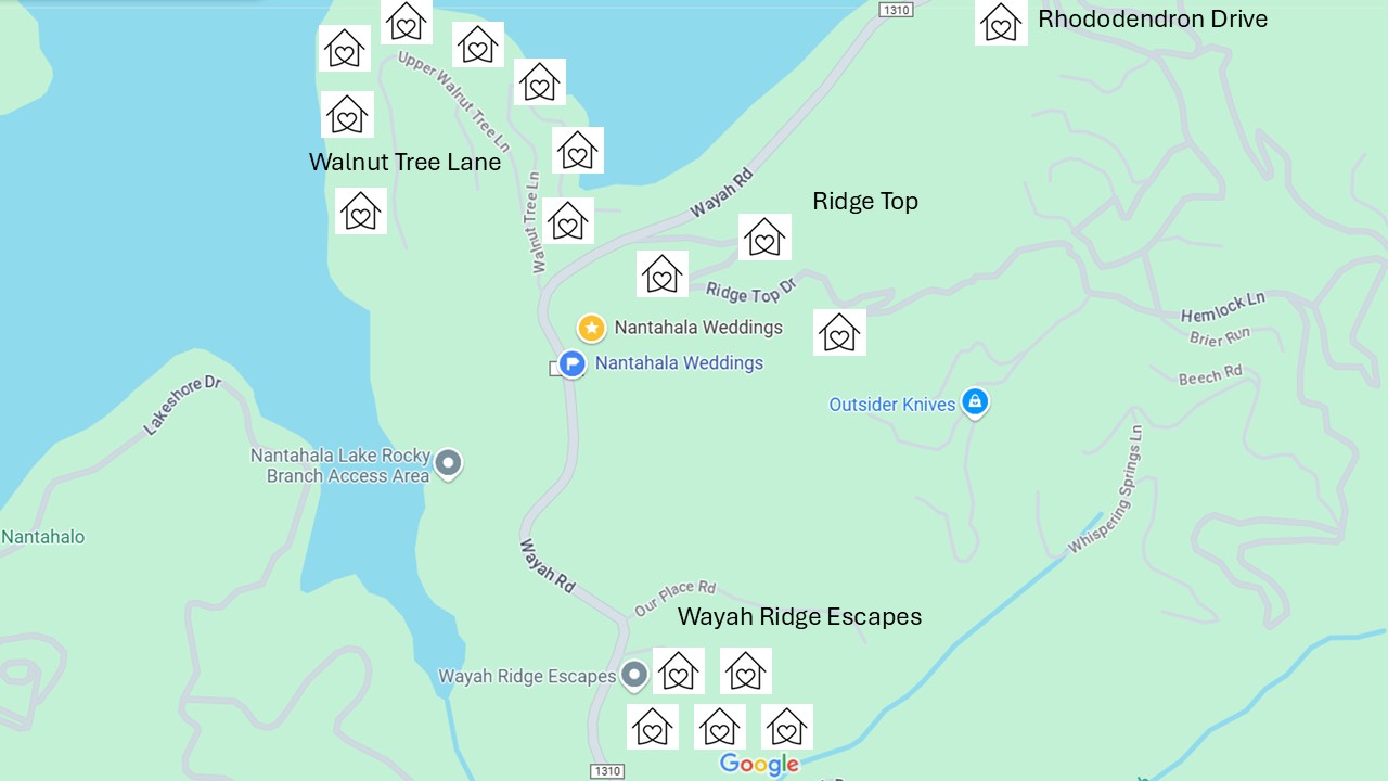 Your guests can stay in one of Nantahala Lake’s many exquisite lake front or lake view vacation homes. Some are within walking distance. Most are within a 5-minute drive from the venue. With so many homes available near the lake, our listings below are not complete. For complete and up-to-date listings, check out these websites:
